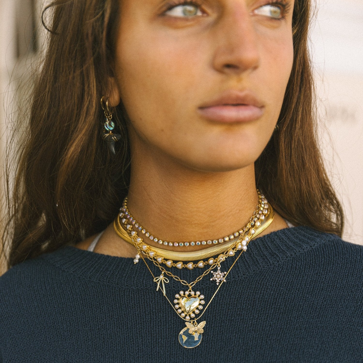 A wire wrapped shark tooth stacked with an Abalone shell on a 24k gold plated / sterling silver baby hoop. The Abalone Shark Tooth Baby Hoops are the perfect mix of edgy and classy! - Pair with the Abalone Shark Tooth Necklace to complete the look!