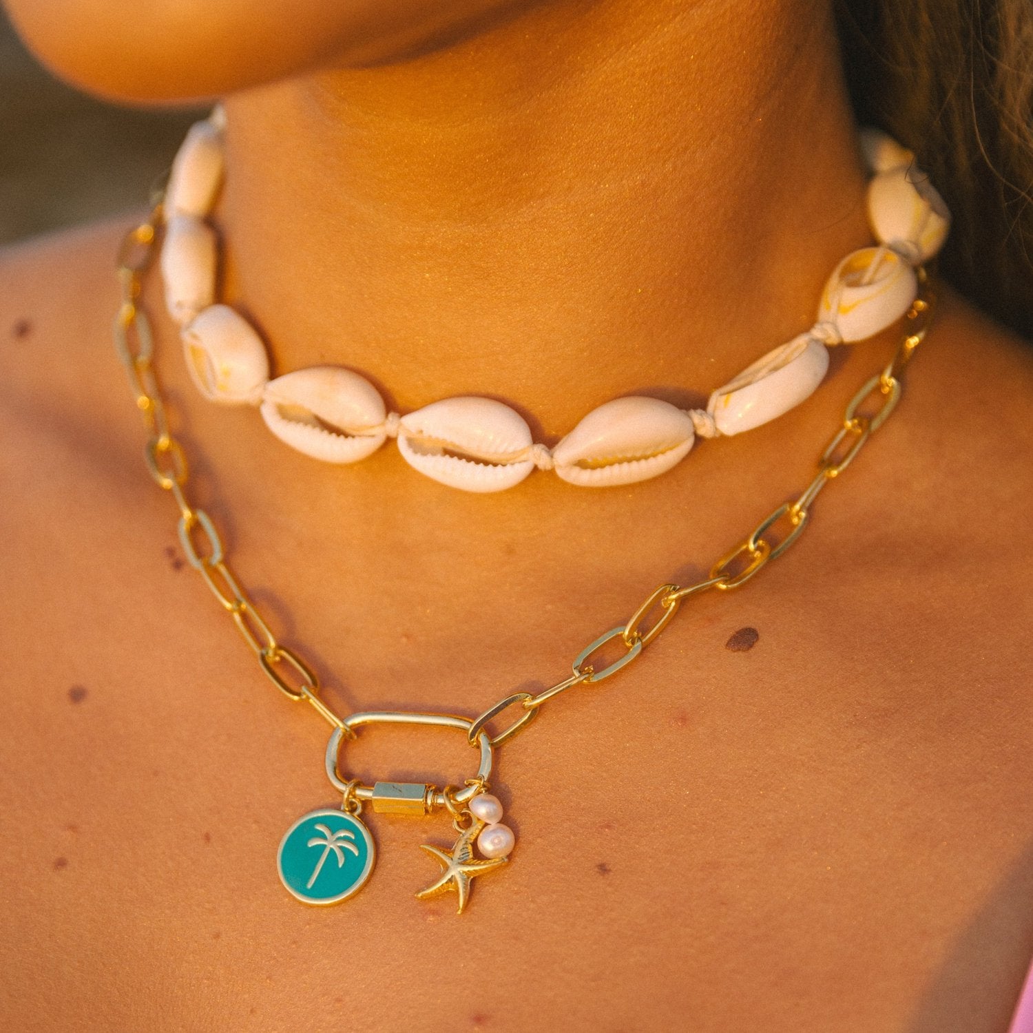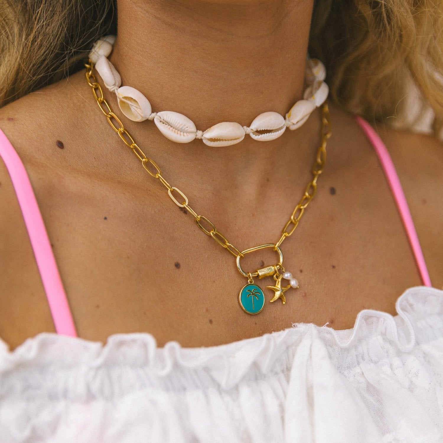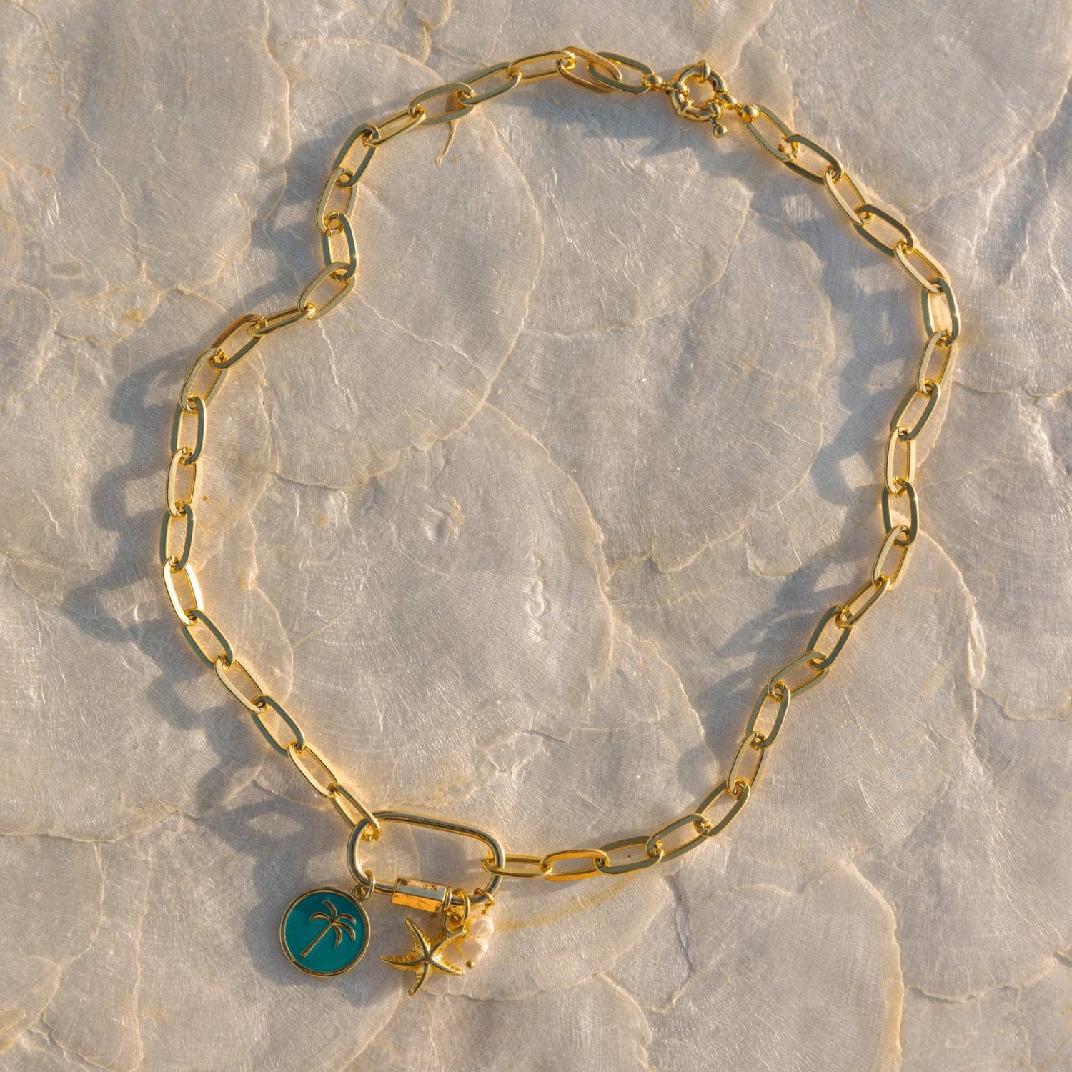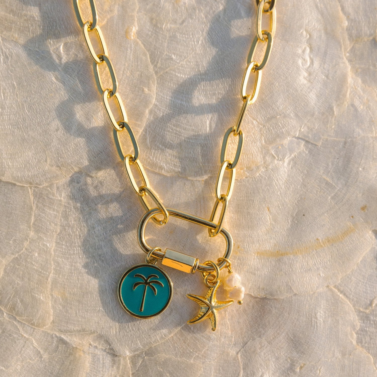 The Blue Crush Necklace is the embodiment of summer. A trendy summer staple that reflects the palms high in the sky, down to the starfish in the deep ocean blue. A perfect representation of the balance that the beach so beautifully reflects. 24k gold plated tarnish free 16”-19”