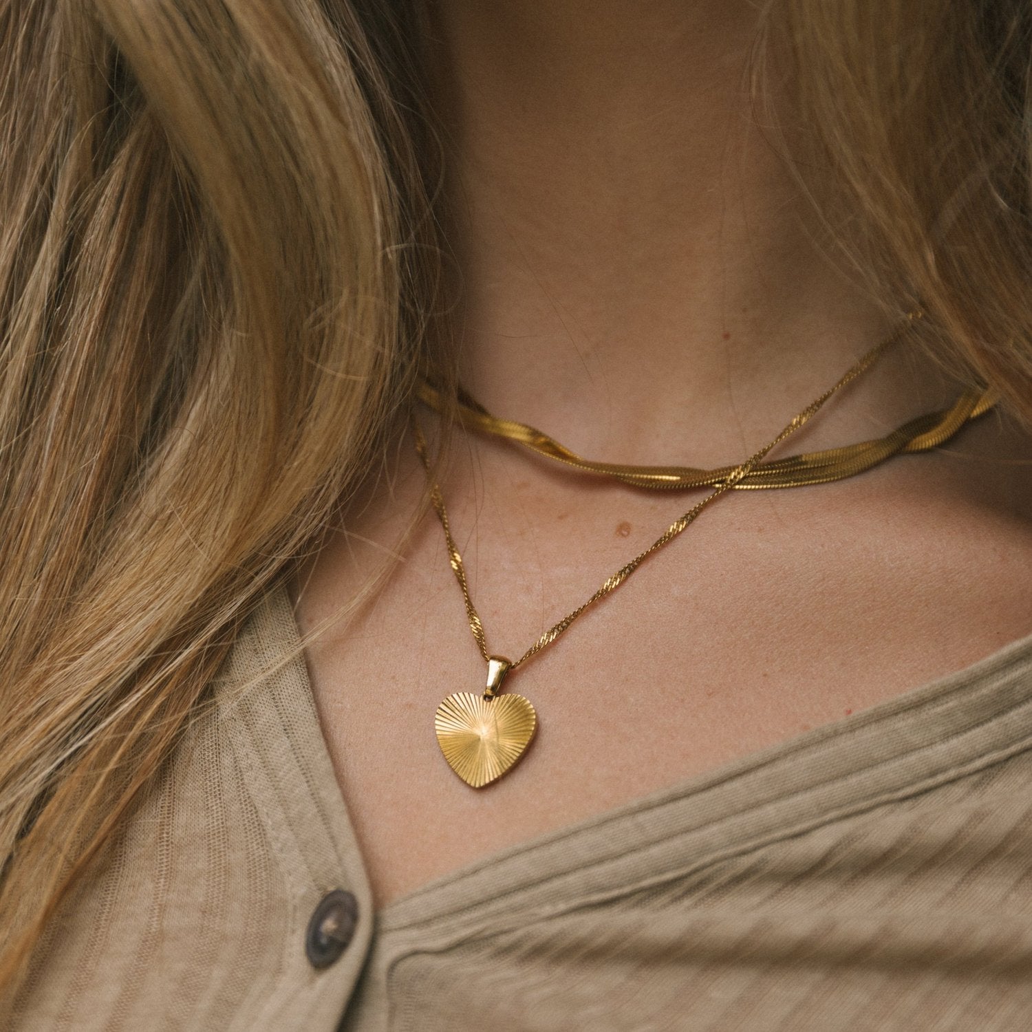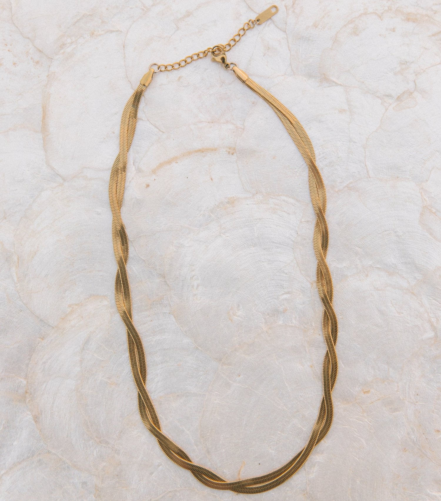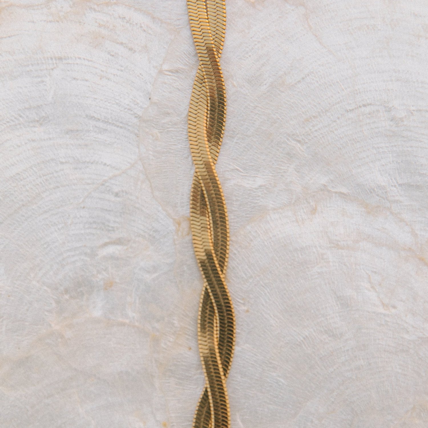 This Braided Herringbone necklace is a 24k gold plated snake chain twisted to create the perfect look. Wear this 16-18inch necklace stacked or solo!