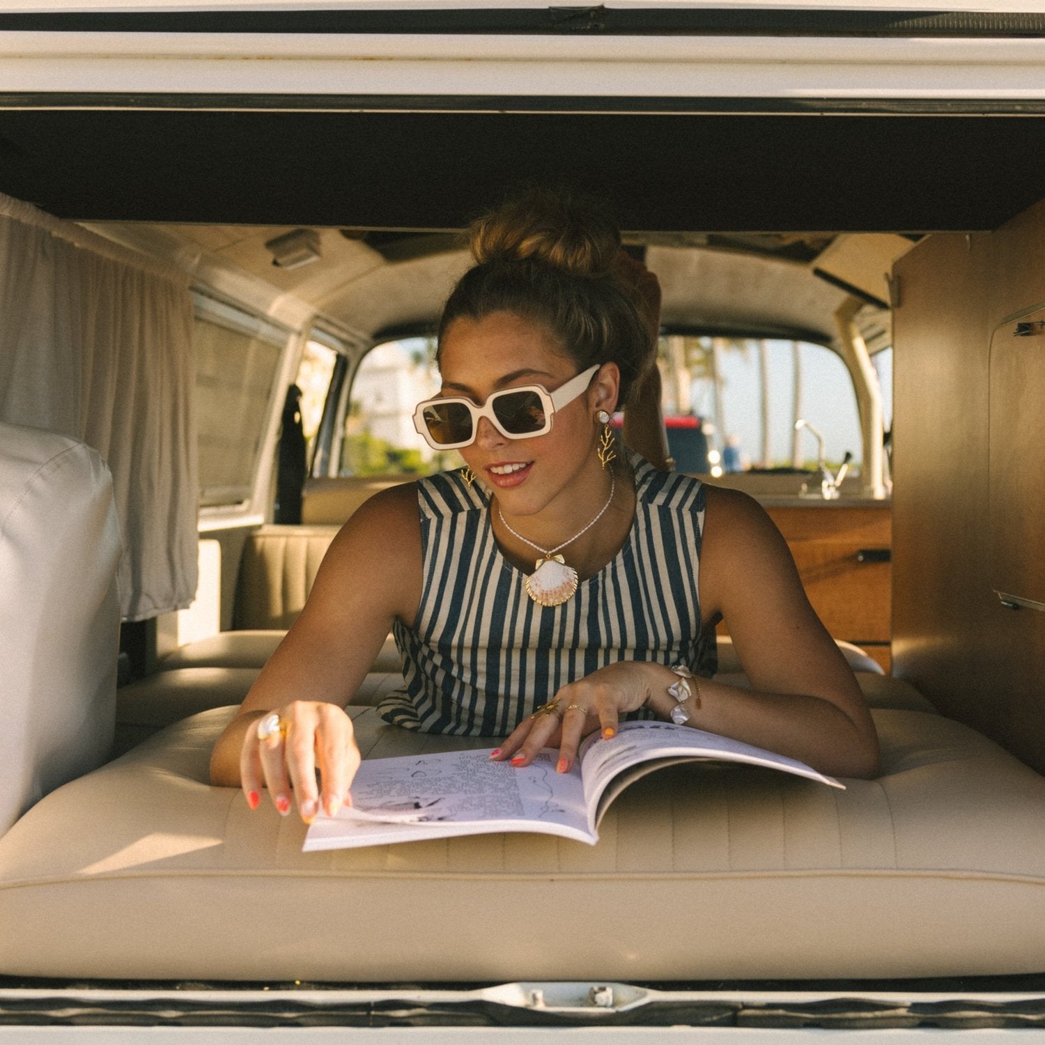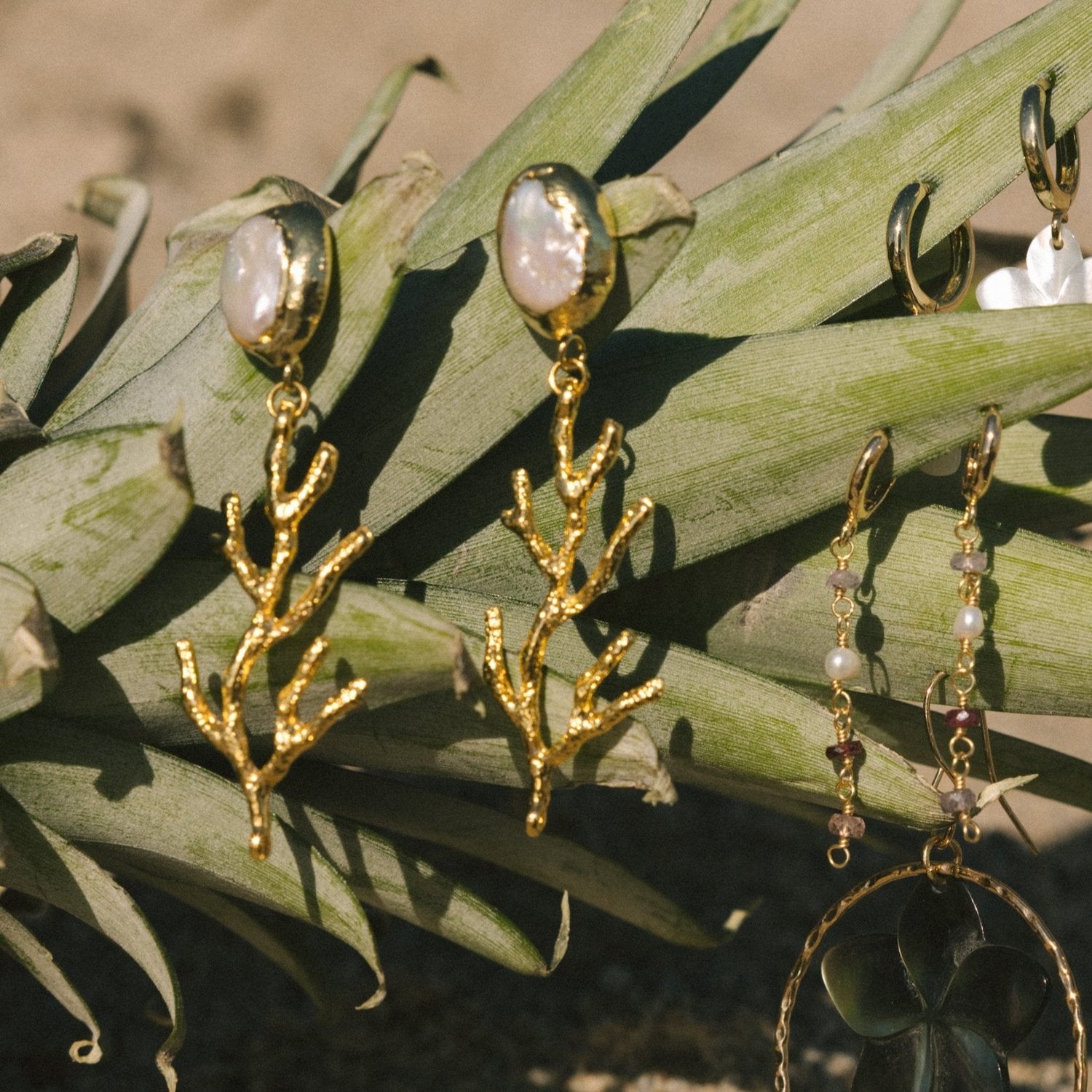 These stunning Coral Earrings feature a delicate yet bold design, crafted in gold on a stud with subtle pops of mother of pearl. A true statement piece that still feels dainty with its lightweight manner, balancing elegance and simplicity. 24k gold plated