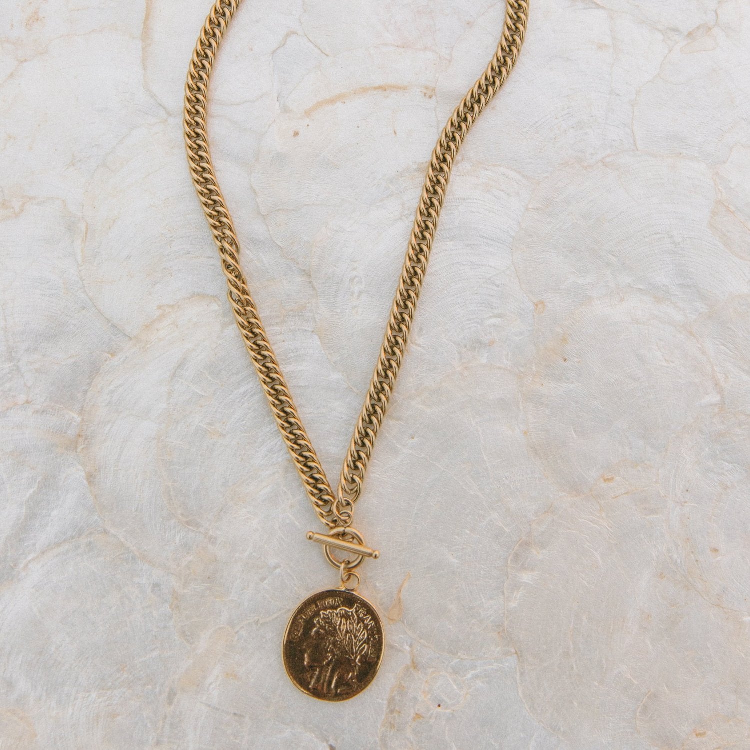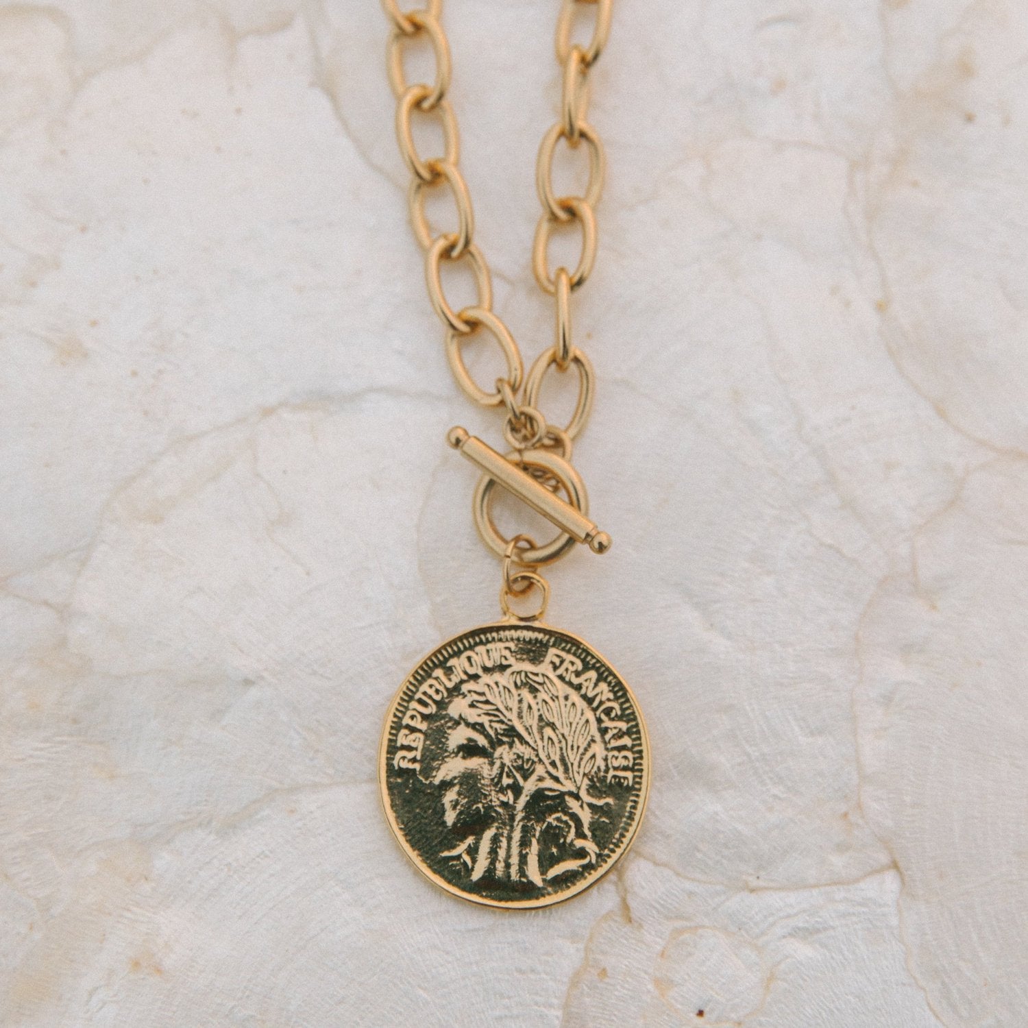 This 24k gold plated Française Coin Necklace is the perfect necklace for any occasion. This 17 inch chain held together by a toggle clasp is both trendy and timeless!