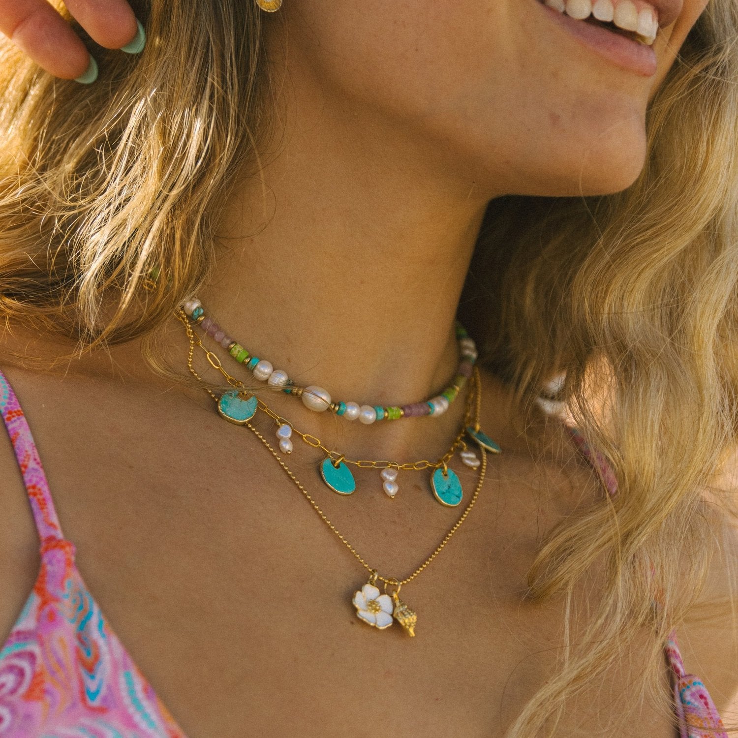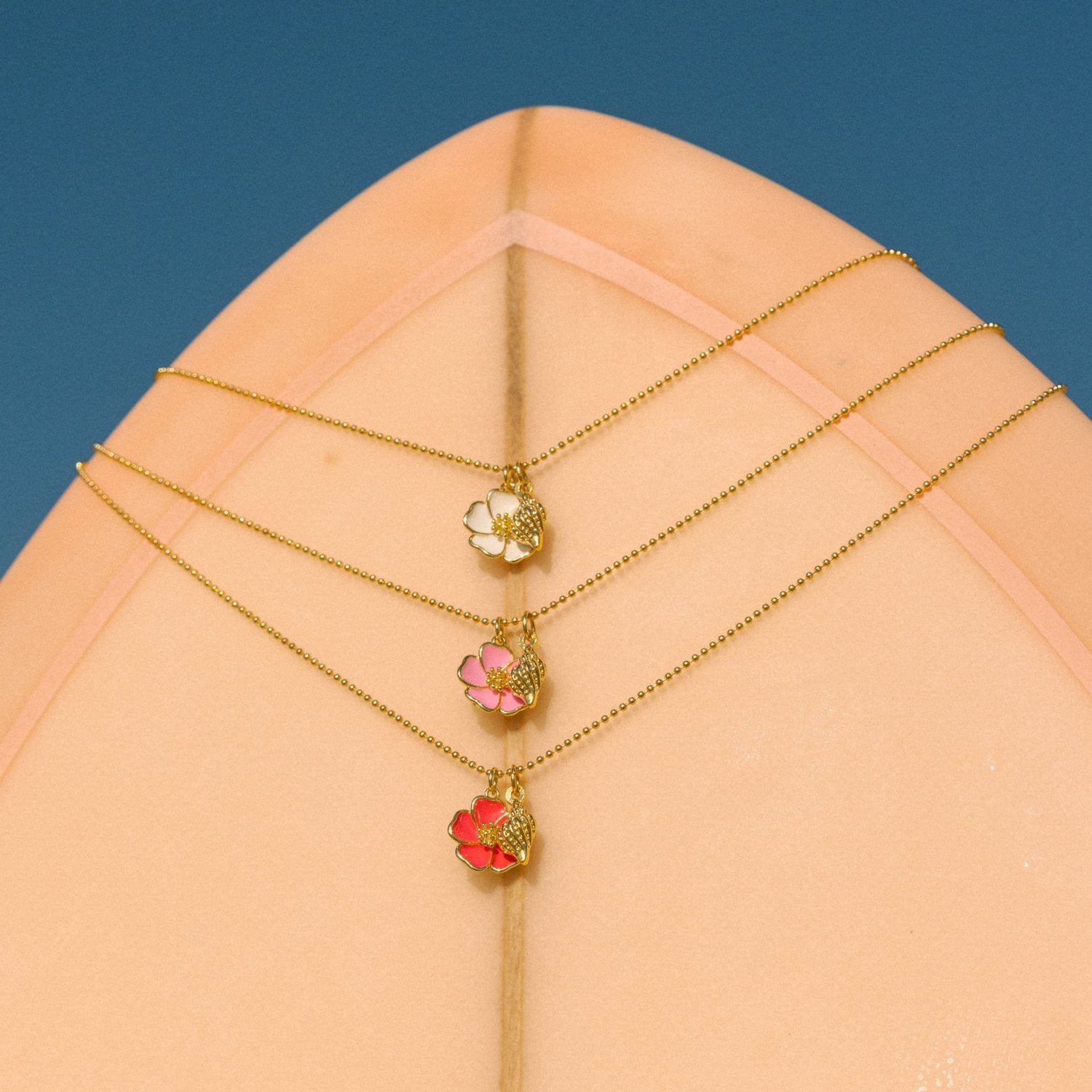 The Hibiscus Necklace is the necklace of the summer! The bright enamel Hibiscus charm paired with a gold conch shell on a ball chain is the perfect representation of the whimsical free spirit of summertime. 24k gold plated tarnish free 19”