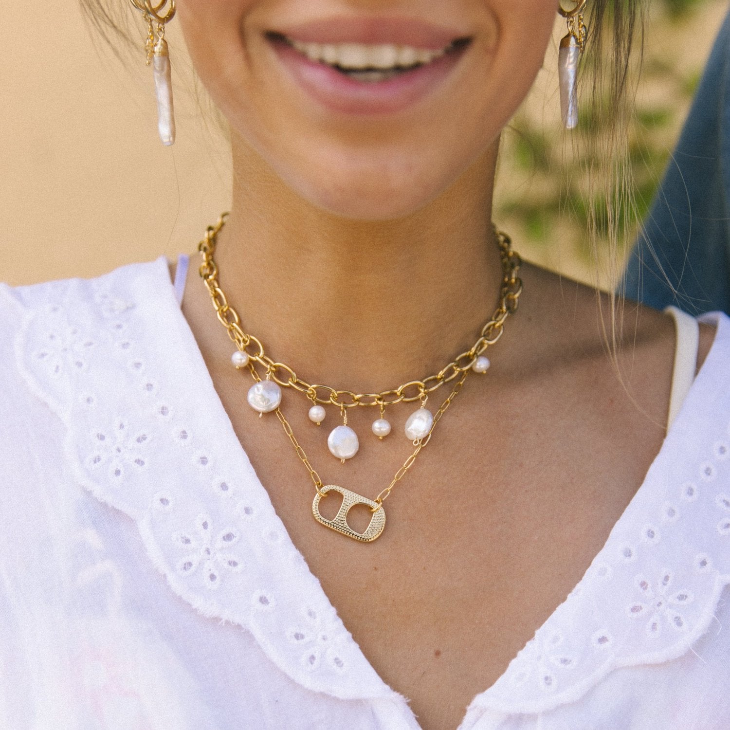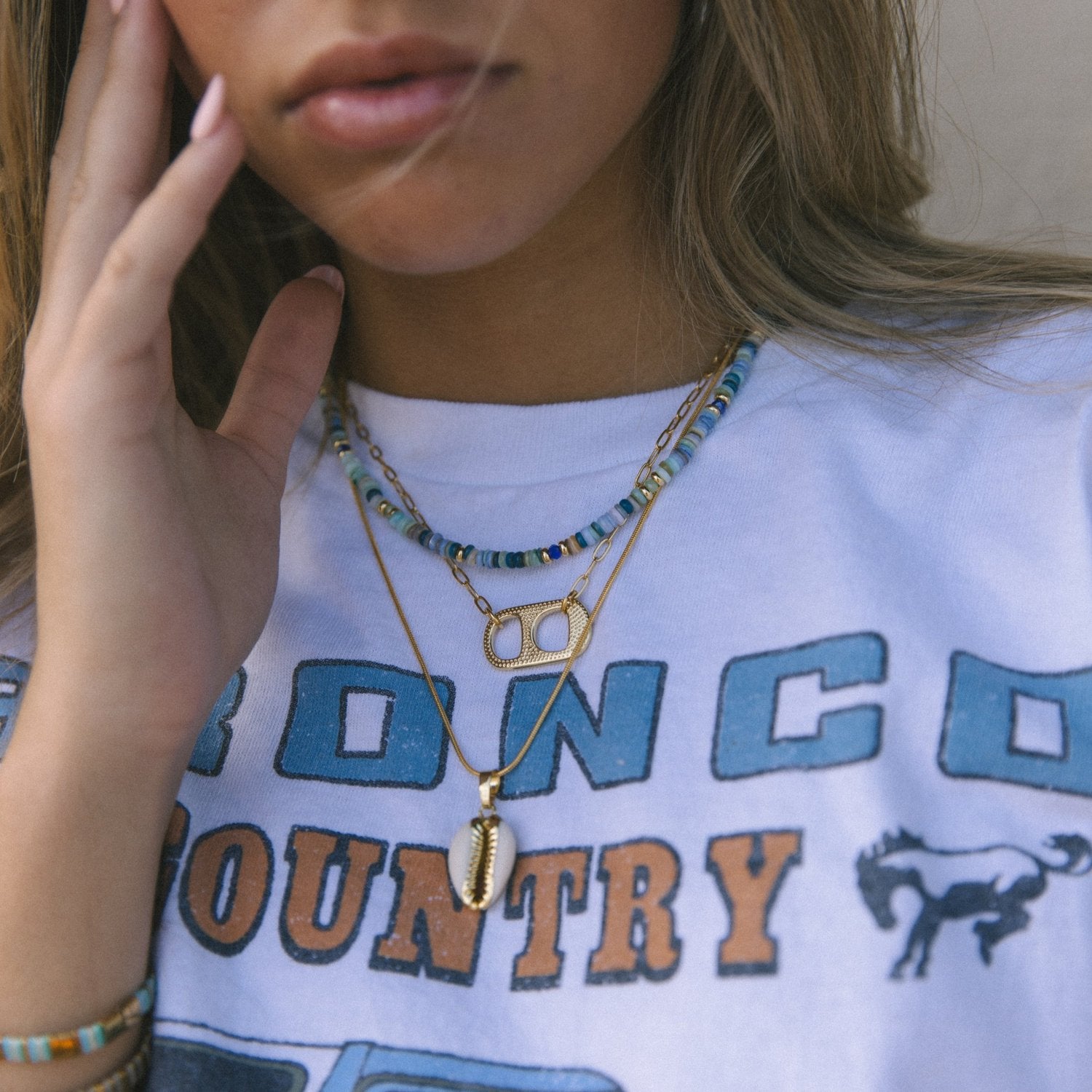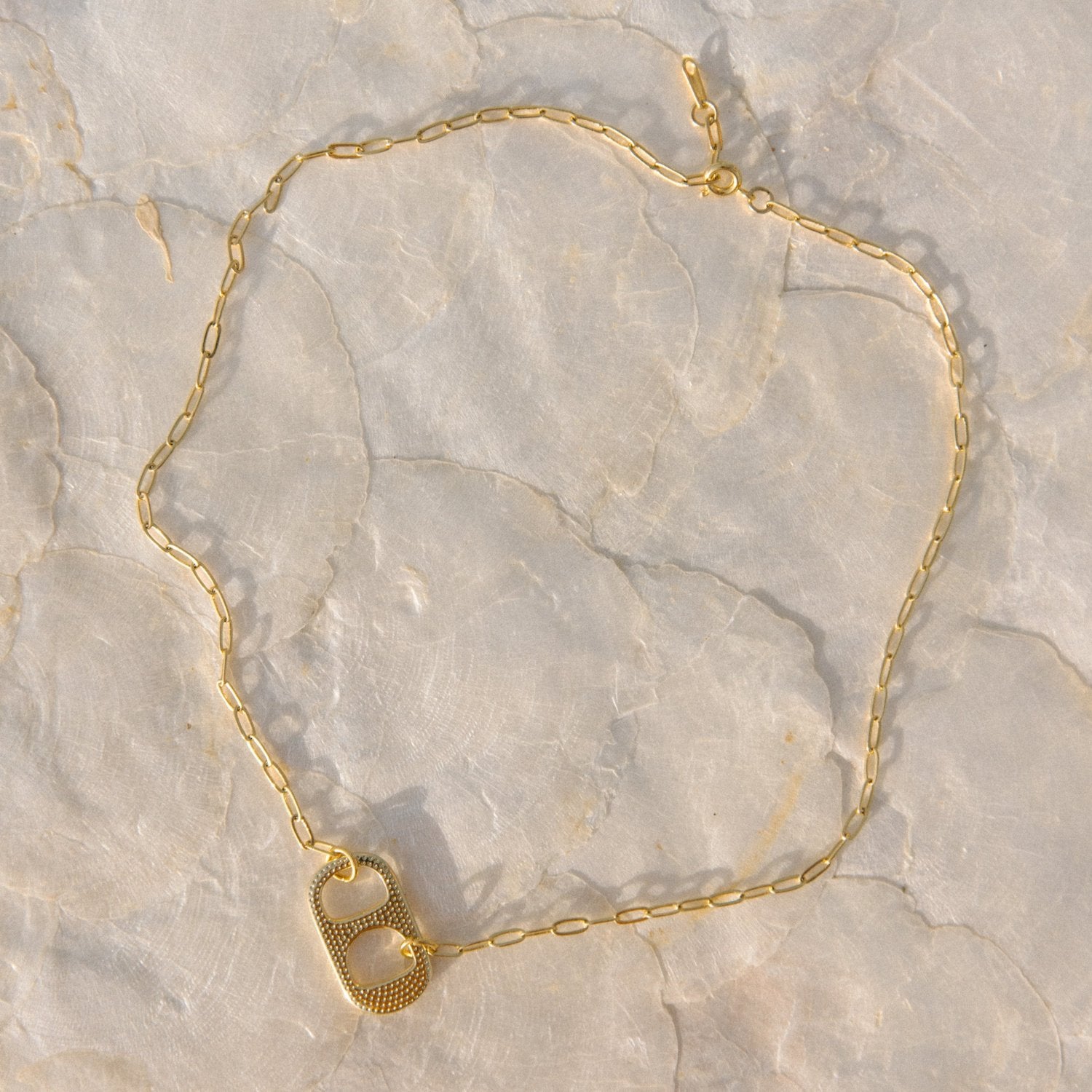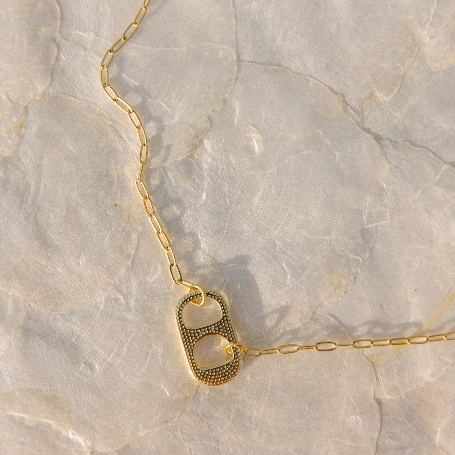A 24k gold plated tarnish free link chain with a can tab charm! The Keeping Tabs necklace is the perfect conversation starter. Both trendy and timeless. Throughout the 70s carrying into the early 80s, young lovers would trade bottle tabs and wear them on a string as a necklace! Love never goes out of style;) 14"-16"