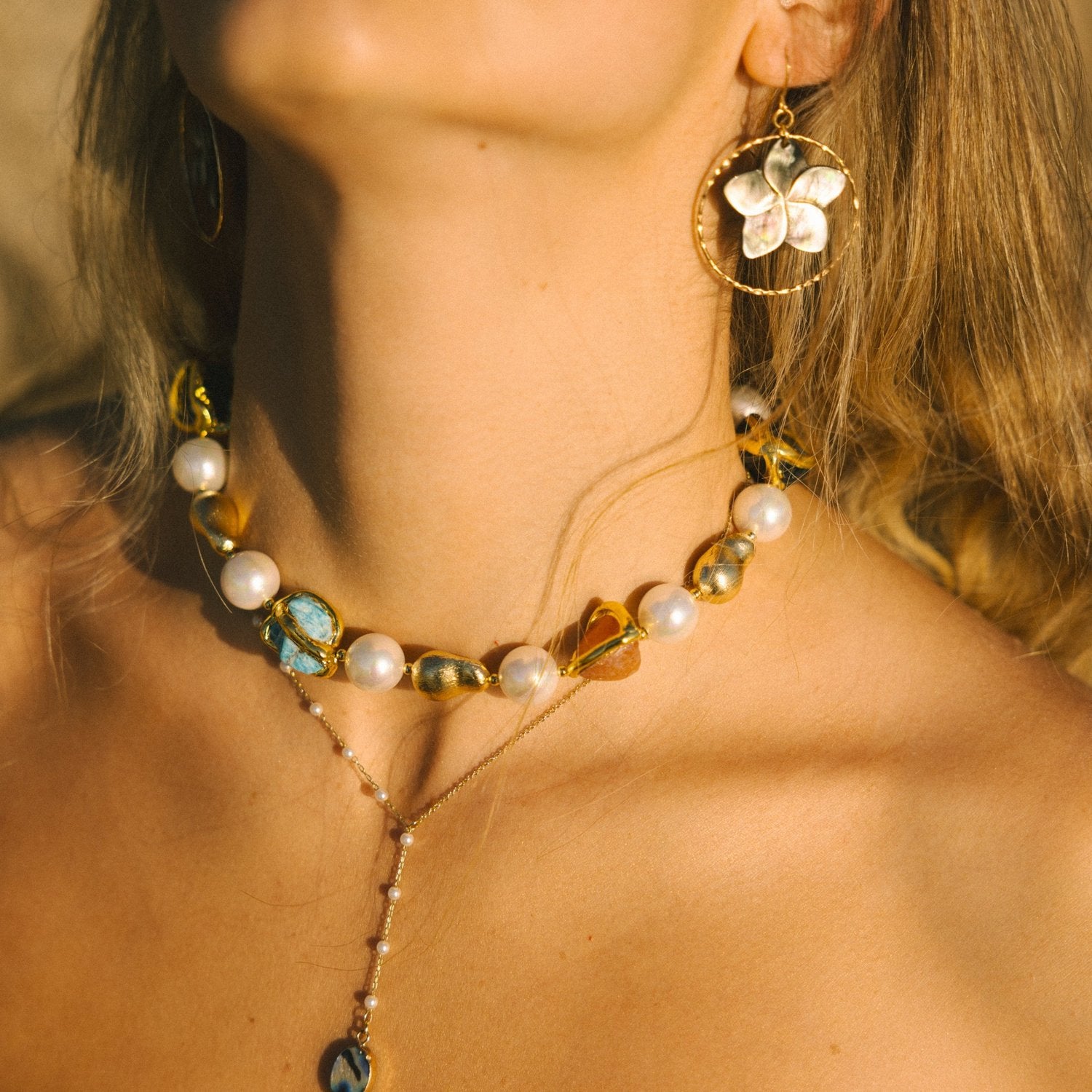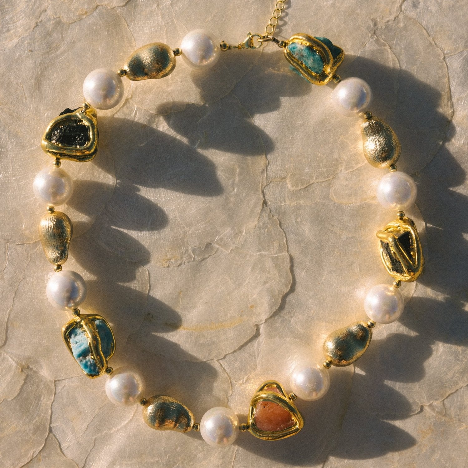 The Leilani Necklace is a chunky beaded necklace that combines freshwater pearls, Blue Apatite, Black Tourmaline, Carnelian, and Shell, each element thoughtfully chosen for its unique healing energy and elegance.