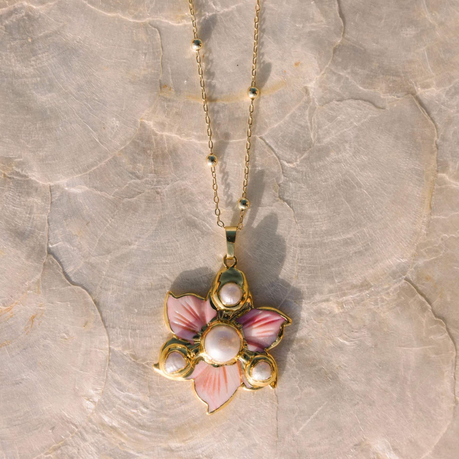 Lorelei is a charming pendant that feels like a giggle from the sea—a delicate flower-shaped charm glowing with pink iridescence. Set on a bobble chain, this piece dances with light and movement, capturing a bubbly, joyful spirit that’s as enchanting as a mermaid’s song. Perfect for adding a touch of whimsy and seaside magic to any outfit!