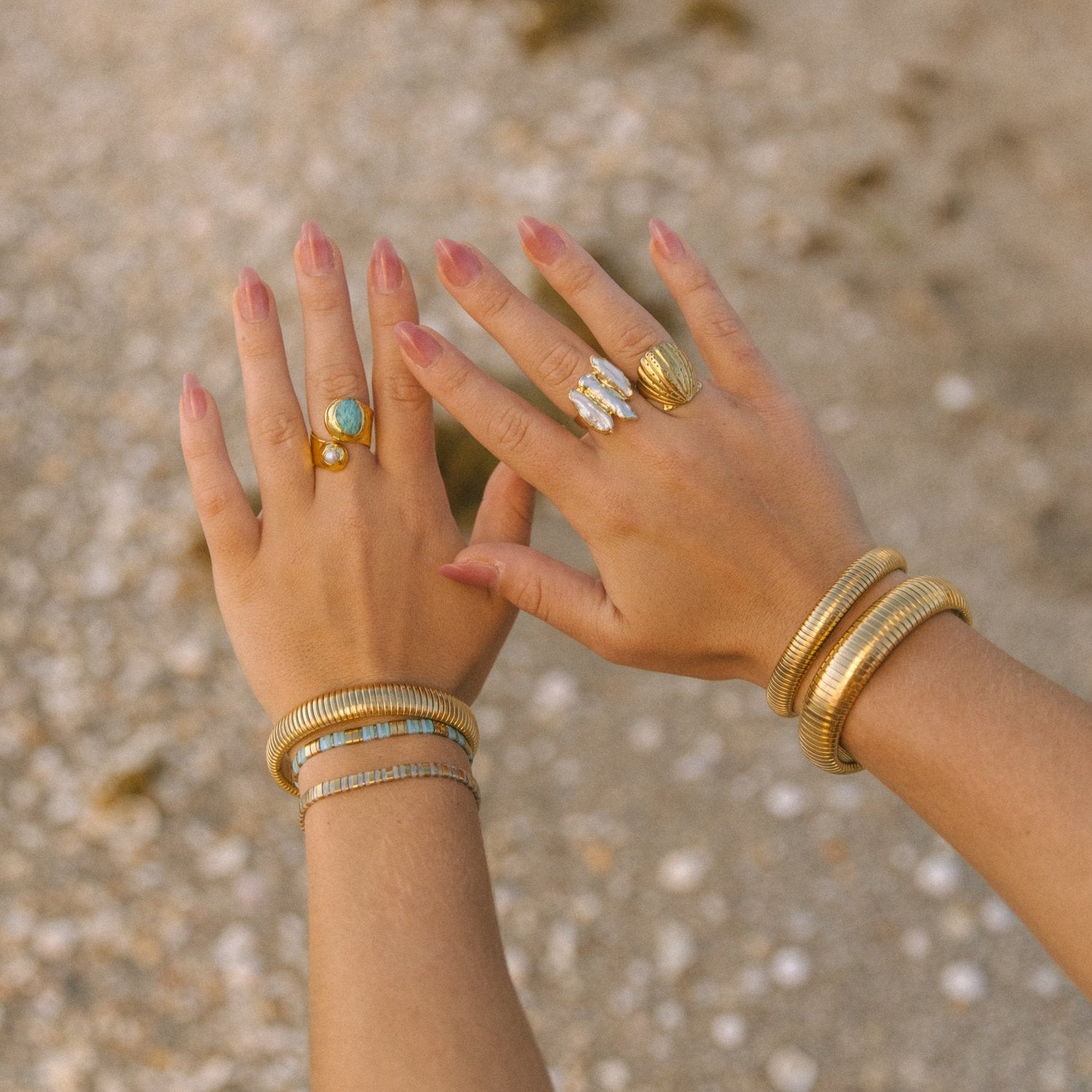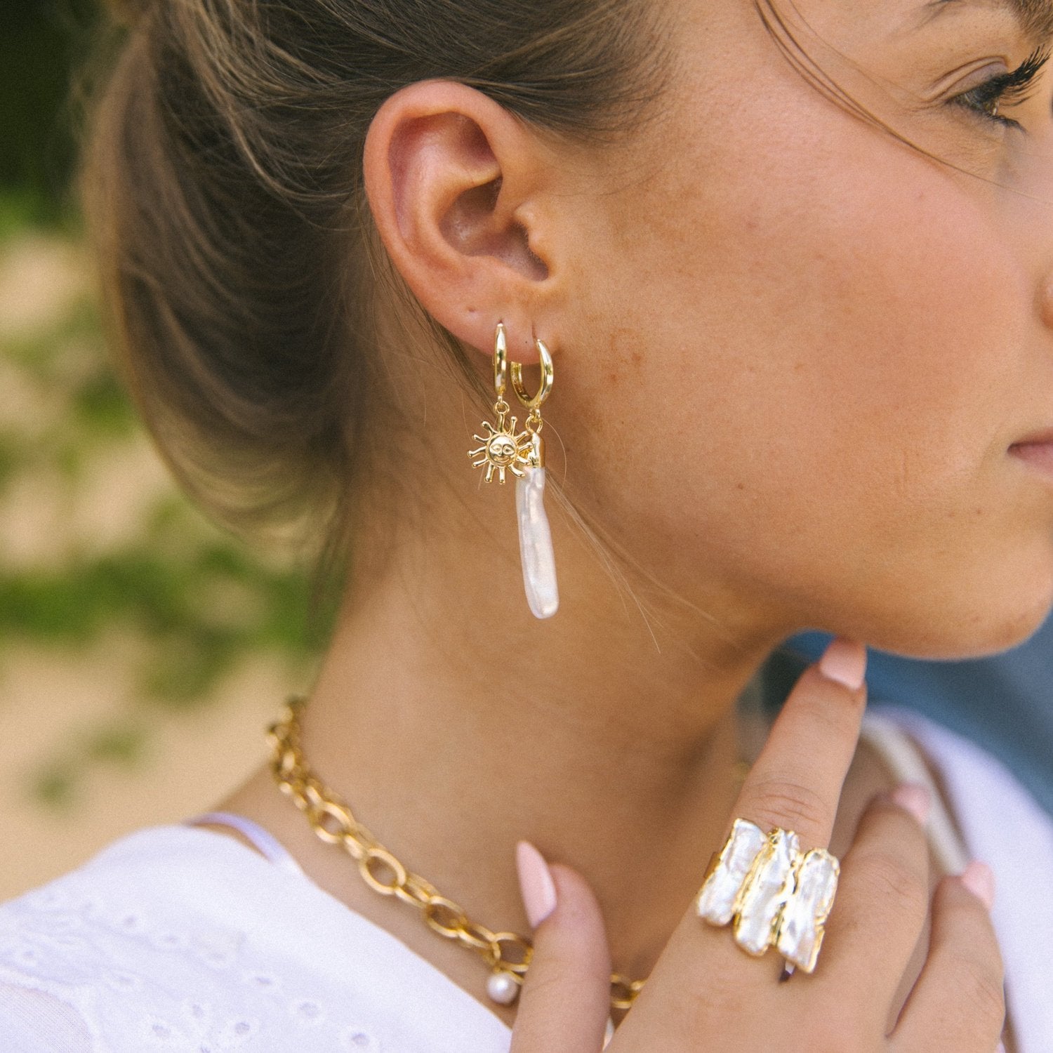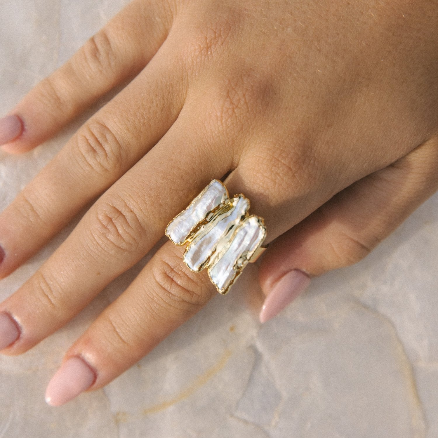 24k gold plated waterproof, elongated, faux freshwater pearl ring! This bohemian ring is adjustable in order to fit comfortably on anyone, big or small!