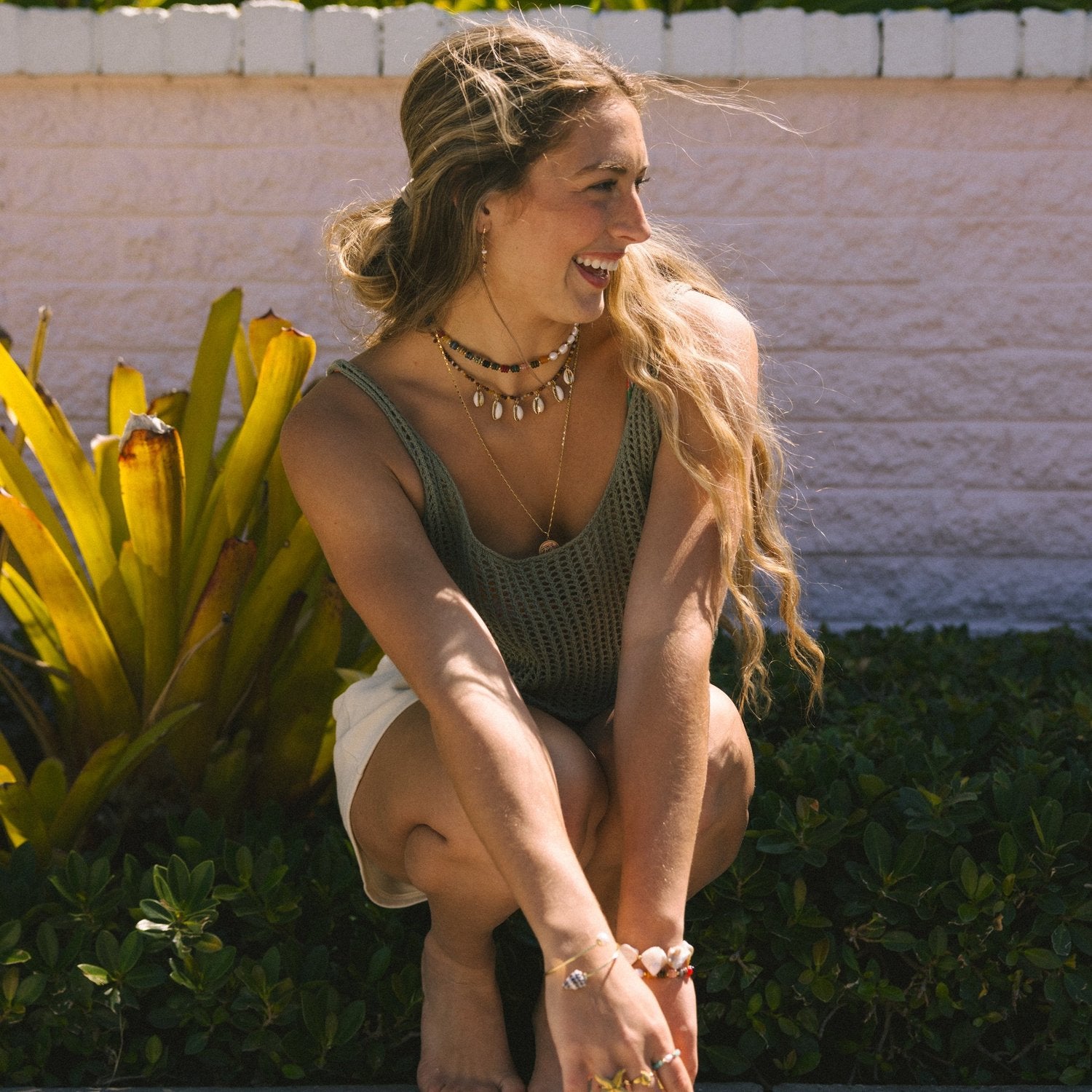 The North Shore Necklace is a multi-colored, earthy design featuring cowrie shells that line the piece, evoking the natural beauty of the islands. Inspired by the Ula Nifo (a traditional Polynesian necklace of strength and protection) and the Ula Fala (a symbol of family and unity), this necklace blends cultural significance with vibrant, coastal style. It’s a striking piece that celebrates both heritage and the spirit of the North Shore!