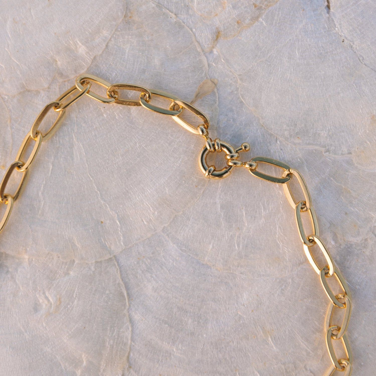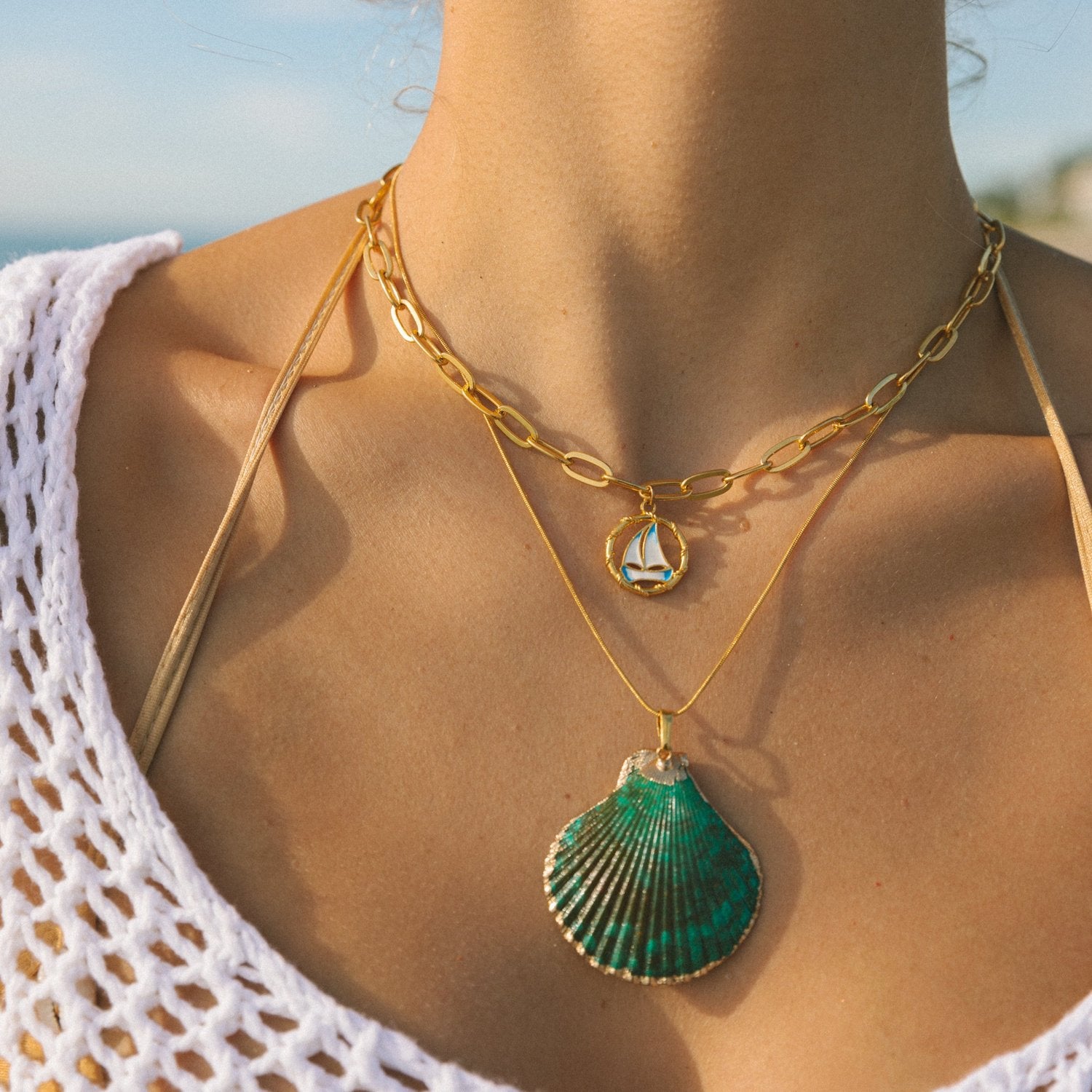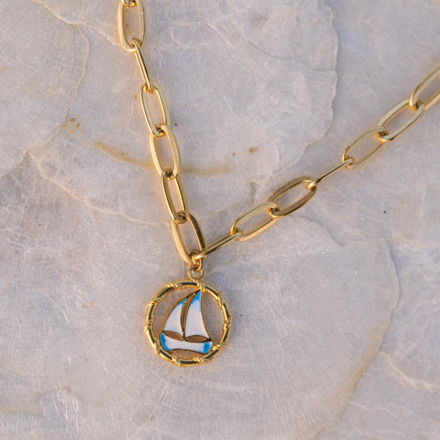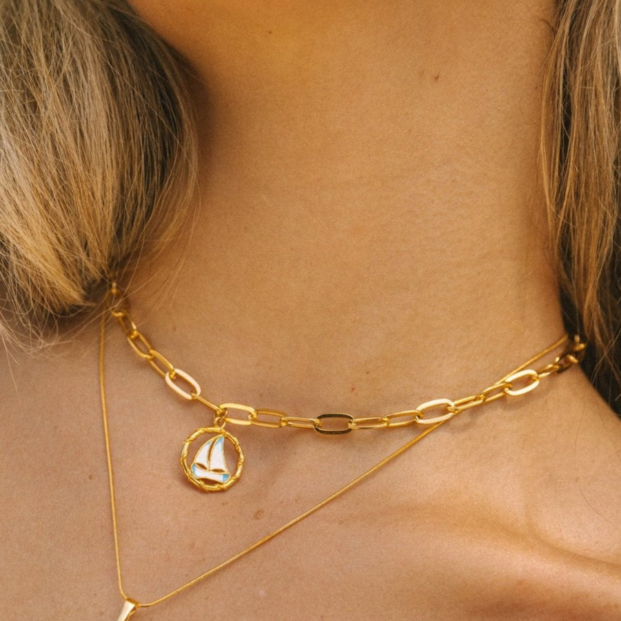This 24k gold plated Sailboat Chain is sure to elevate your beachy attire. If you want a necklace that is both classic, and a conversation starter, this is the one! 100% Tarnish free (just rinse off in freshwater after the beach!) and ready for all of your ocean activities! 18 inches - adjustable (worn shorter to sit at 15" in the photos)