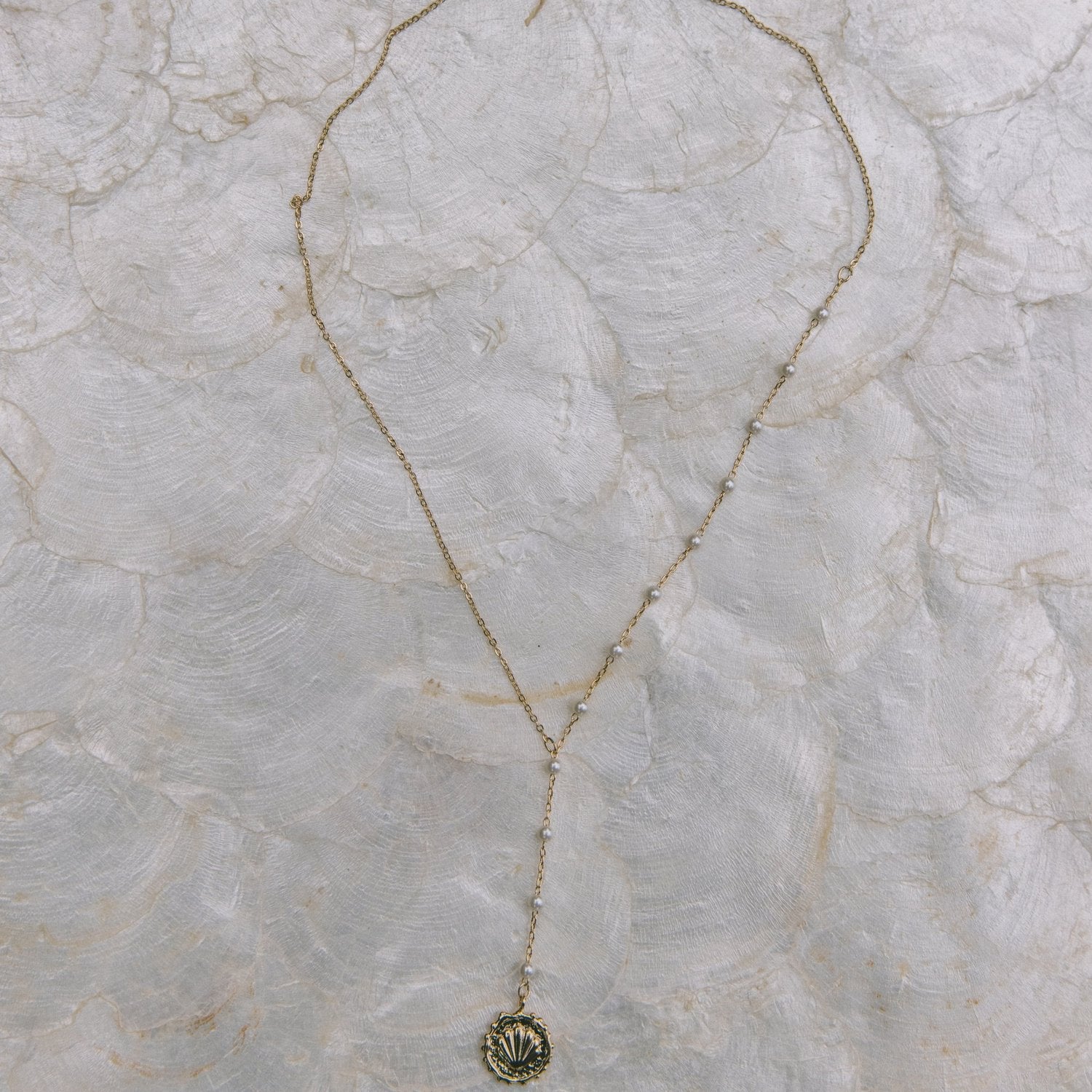 Effortlessly chic and always on-trend, the Scallop Drop chain adds a distinctive dainty chain pearl bead lariat design topped with a scallop shell pendant. This 24k gold plated necklace is perfect for any beach day, or elevated night out. 16.5-19in with a 2in drop