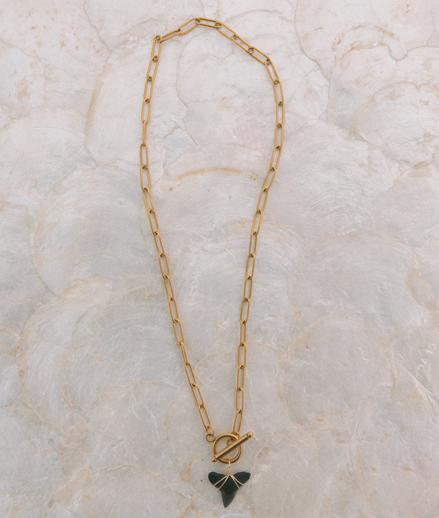 This 24k gold plated Shark Tooth Toggle Necklace is the perfect necklace for any occasion. The wire wrapped shark tooth on a 17 inch chain held together by a toggle clasp is both trendy and timeless!