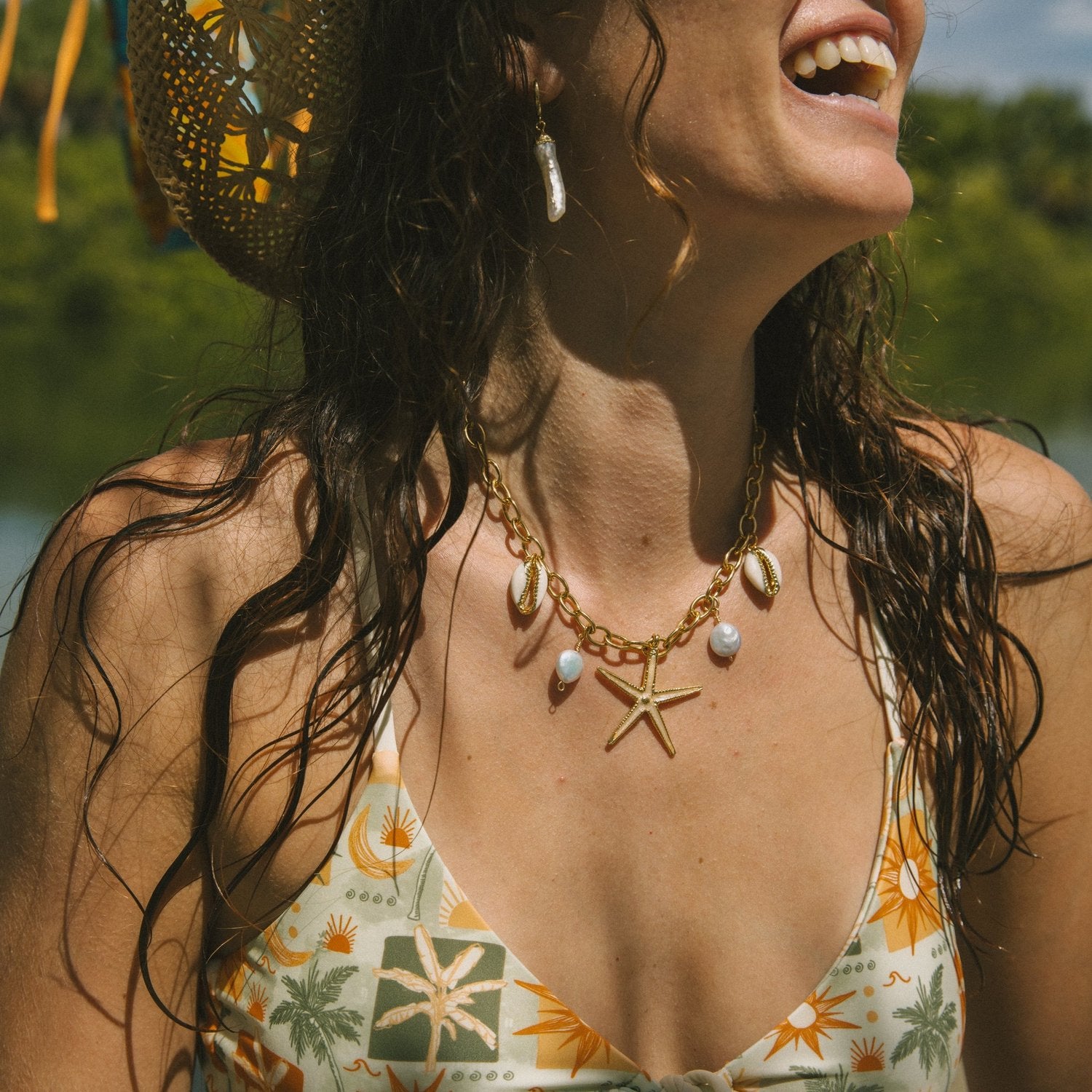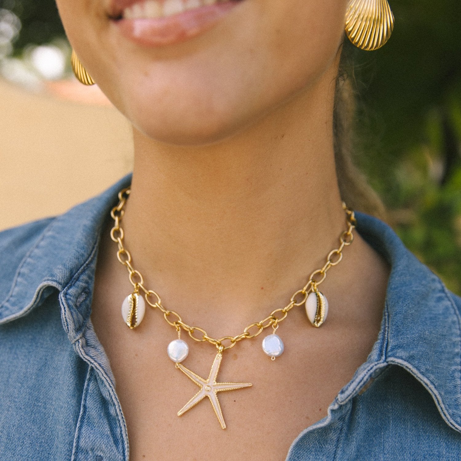This 24k gold plated tarnish free chunky charm necklace is a staple for any occasion! Dress it up, wear it casually, and style any way you want. With three two hand wire wrapped freshwater pearls, two gold dipped Puka shells, and an iridescent starfish, the Sirens Charms Necklace is sure to captivate. A quality piece that will last you a lifetime. 14"-16"