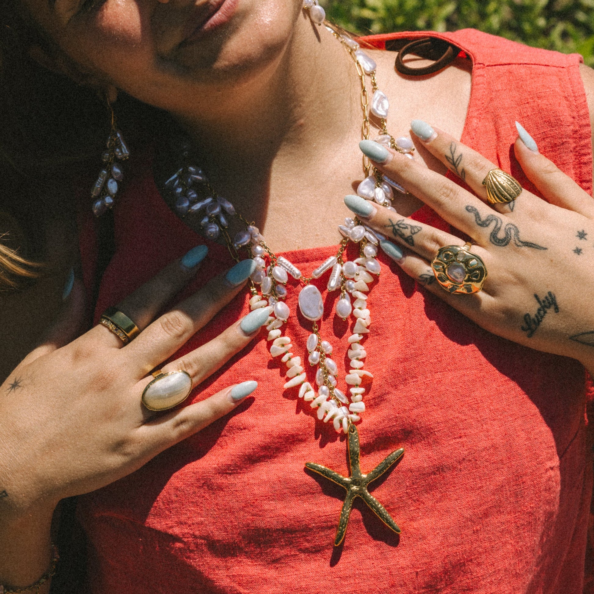 Star Cay embraces a bohemian vibe with a long 26-inch silhouette. Featuring a bold gold starfish pendant, it’s beautifully accented by white beachy beads—perfect for adding effortless island-inspired elegance to your style!