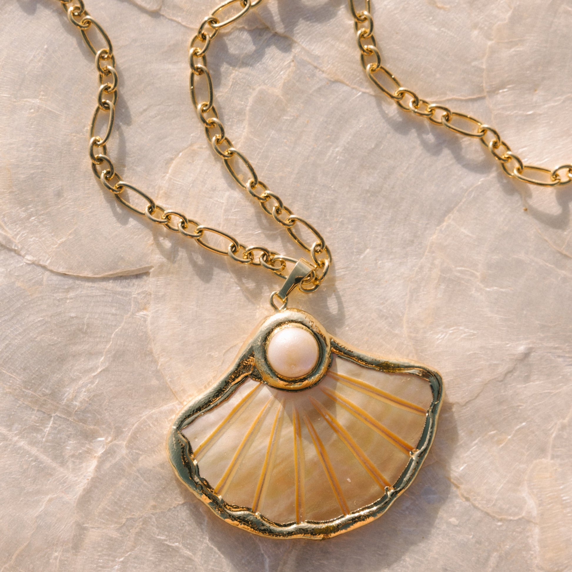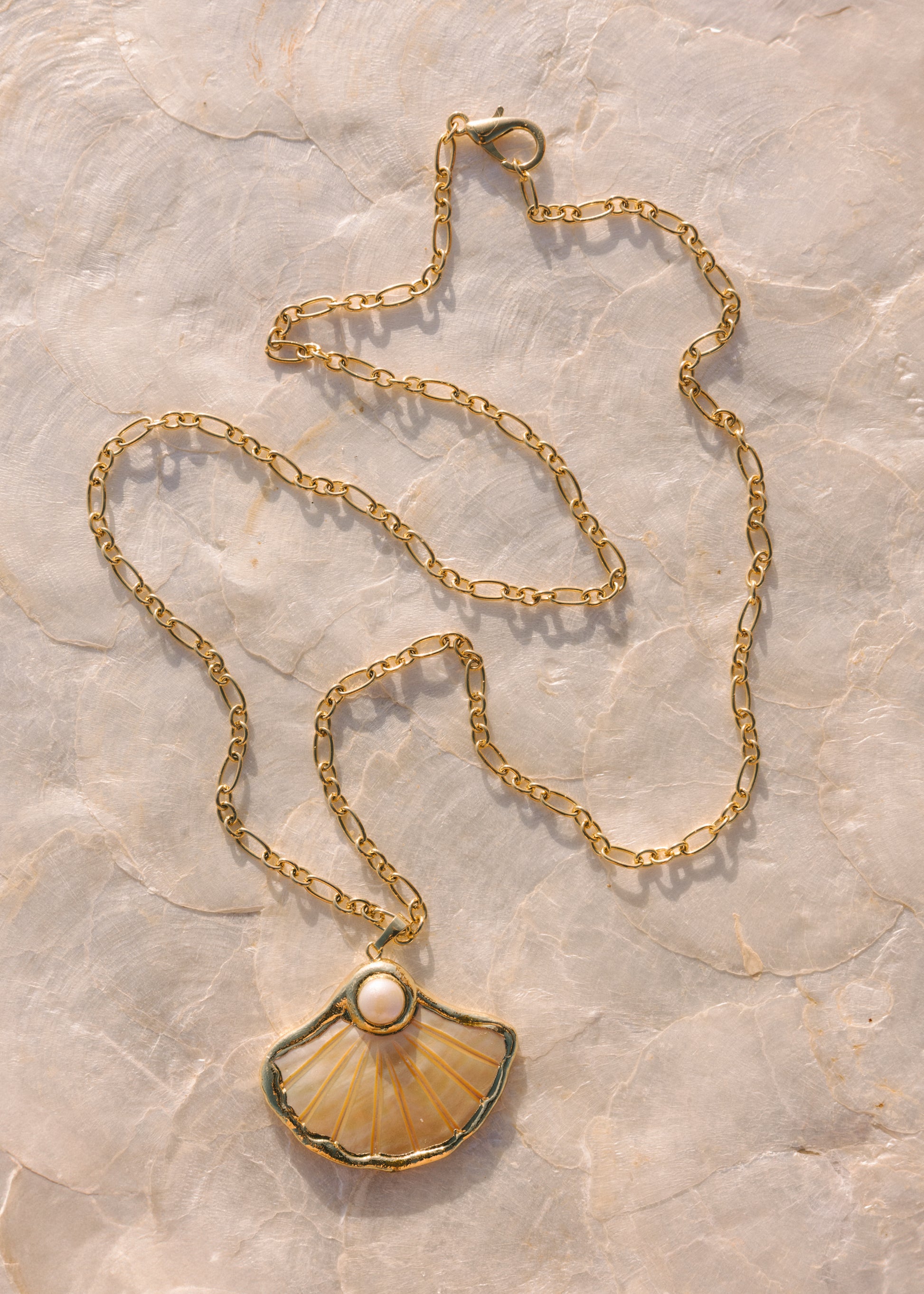 Handmade and 24k gold-plated, The Abacos Necklace is inspired by the natural beauty of Great Abaco and Little Abaco Island—the twin gems of the Bahamas. One features a luminous pearl, reminiscent of soft sands and moonlit tides; the other, a vibrant turquoise stone echoing the clear Bahamian waters. Designed for boho mermaids at heart, these scallop shell pendants bring island elegance to everyday life. 32in - adjustable