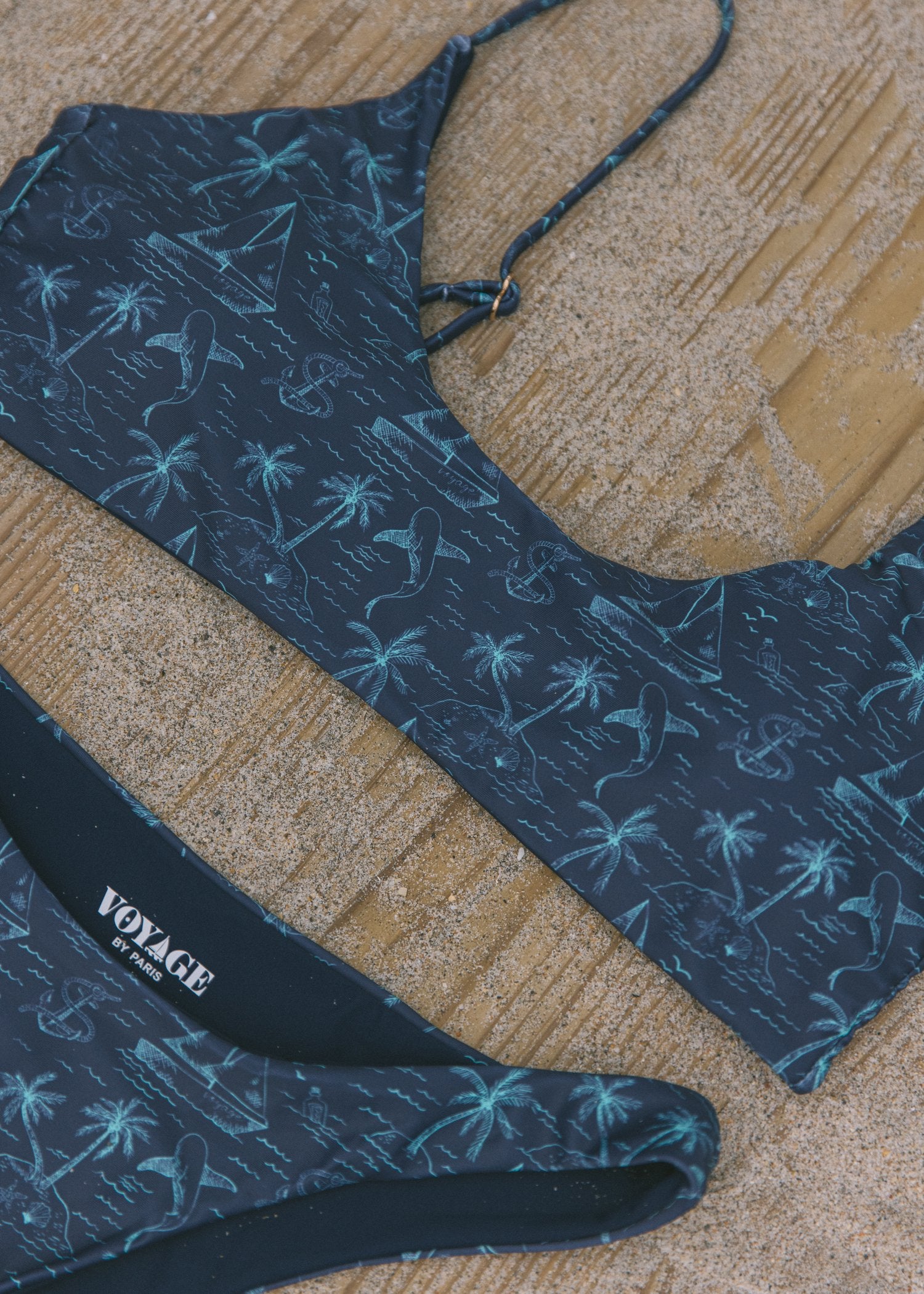 A sporty bikini with a unique ocean design! The Voyage Top is a timeless look that tells the story of a Voyage across the seas. Sail through an ocean dream with an island in the sun, a message in a bottle, and some shark friends along the way! This year-round staple is sure to keep everything in place with its stretchy fabric and ultra-flattering cut. Match in the Voyage Board shorts or pair with the Voyage Bottoms to complete the look!