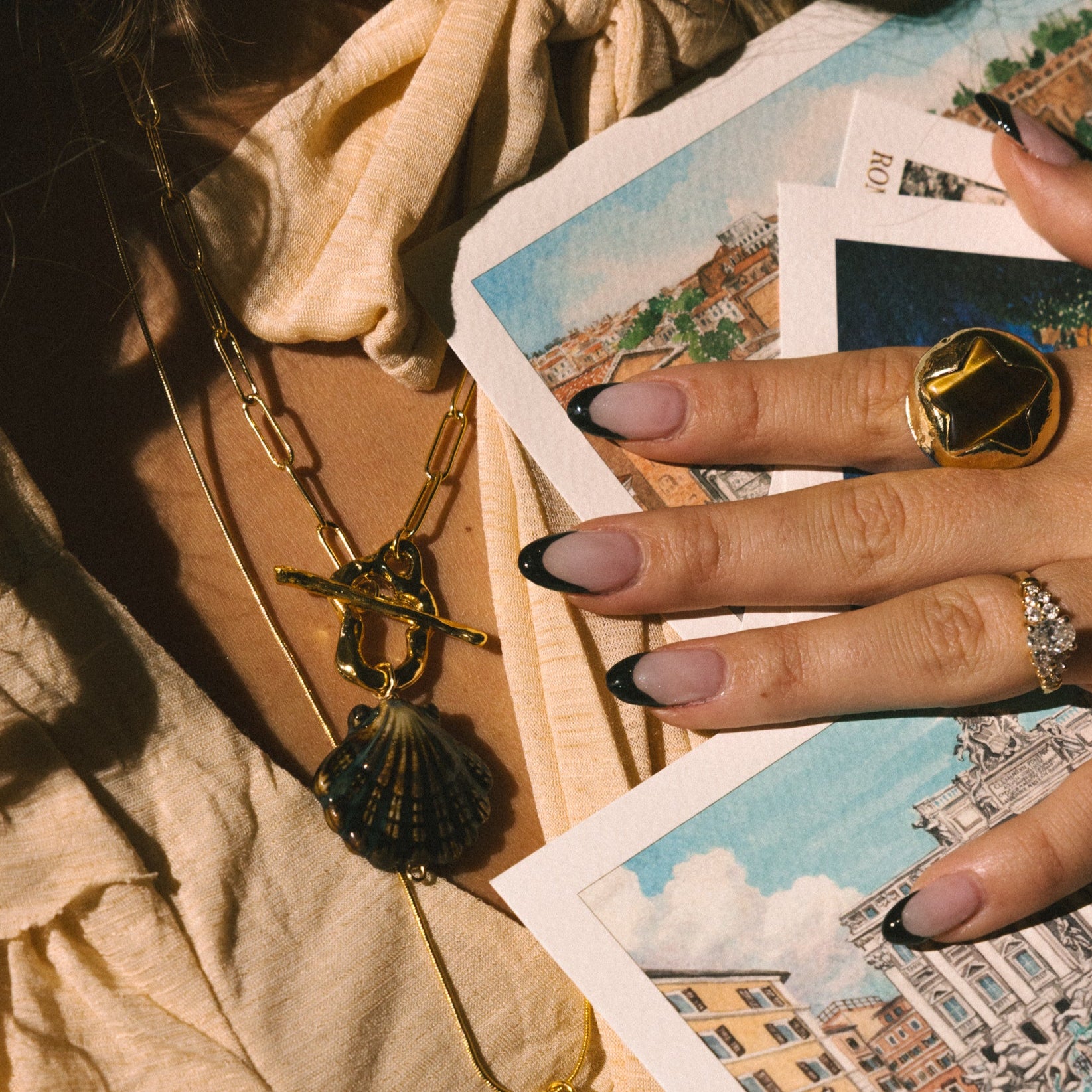 Handcrafted with a 24k gold-plated toggle and a ceramic scallop shell, the Scallop Noir captures the quiet elegance of the sea’s hidden corners. A symbol of protection and rebirth, the shell reflects the beauty of what’s found when we let the tide reveal what was once beneath the surface.